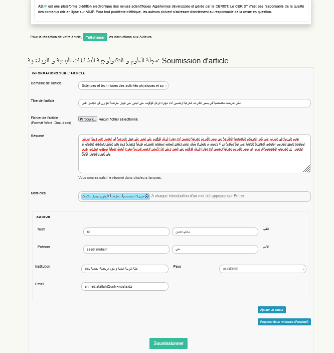 Les informations relatives à l'article, aux auteurs, ainsi que le résumé et les mots-clés doivent être renseignées.