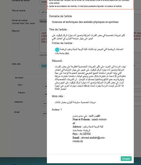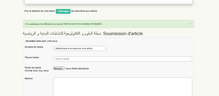 L'article doit être préparé et rédigé selon le modèle de l'article (modèle de rédaction d'article) qui a été téléchargé préalablement depuis la plateforme et doit respecter toutes les conditions indiquées dans ce modèle.
